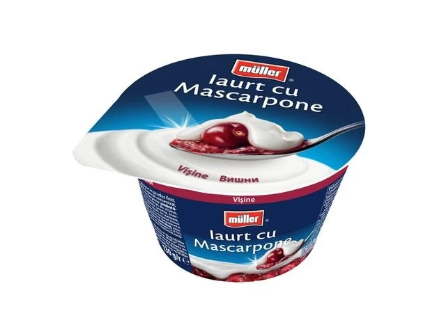 Описание продукта: йогурт с маскарпоне и 24% кислой вишней Состав: йогурт (пастеризованное цельное молоко, сливки, обезжиренный молочный концентрат, йогуртовые культуры (содержащие молоко)), 9,6% кислой вишни, сахар, вода, 3% маскарпоне (сливки, концентрированный лимонный сок), 2,3% кислой вишни из концентрированного вишневого сока, крахмал, загуститель пектин, концентрированный краситель из трав (арония, морковь), натуральный ароматизатор.