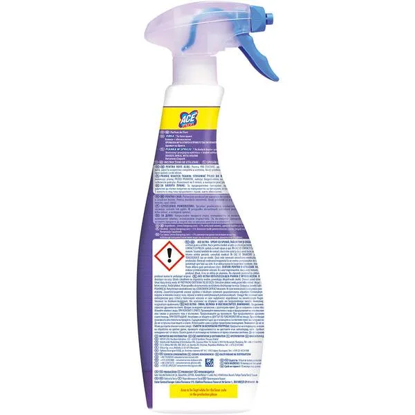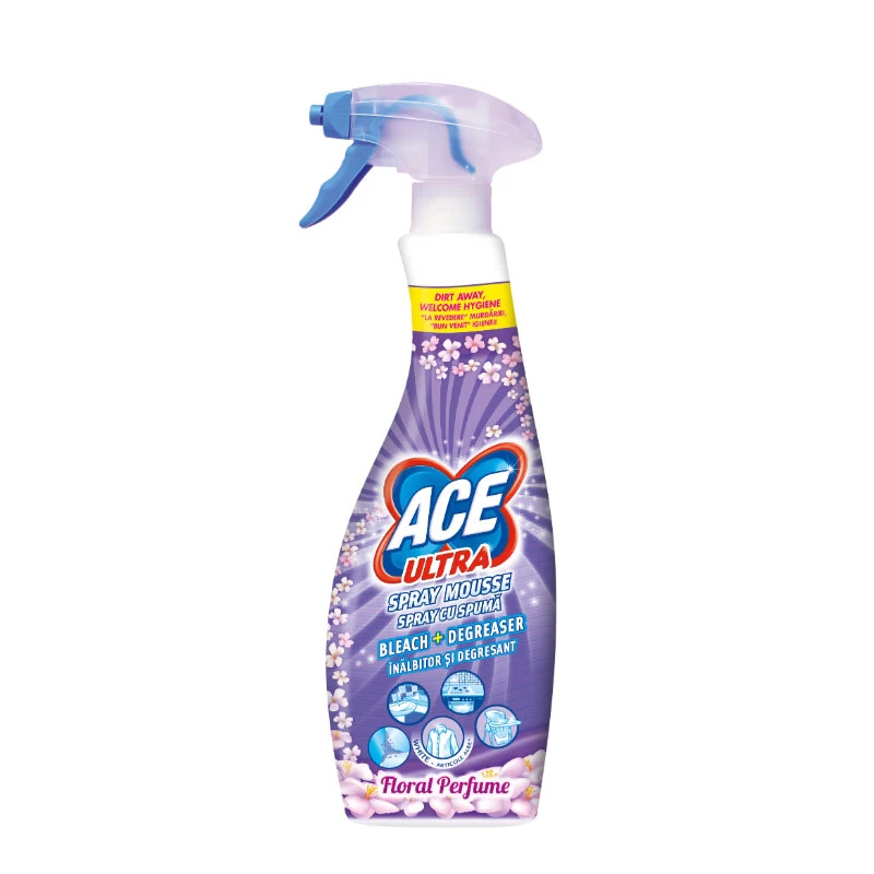 ACE ULTRA SPRAY CU SPUMA 700ML FLORAL является одним из самых эффективных жидких отбеливателей в мире. Он содержит добавки, защищающие ткань от повреждения и поэтому отбеливают лучше и бережнее, чем другие жидкие отбеливатели. АСЕ эффективно удаляет пятна от чая, вина, черники, фруктов и кофе, пятна органического происхождения, а также восстанавливает белье застиранных тканей.