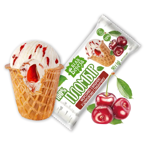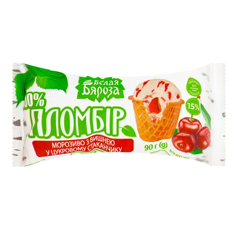 - Пломбир с вишней в сахарном вафельном стаканчике Белая Бяроза 90 г