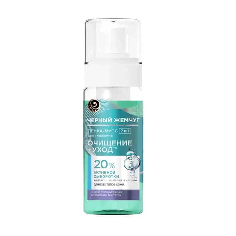 Черный Жемчуг Очищение+уход пенка-мусс для умывания 2в1 для нормальной и комбинированной кожи, 150 мл прекрасно удаляет макияж. Она не пересушивает кожу и дарит чувство увлажненности на 24 часа. Мусс для лица на 20 % состоит из активной сыворотки с жидким коллагеном. Она способствует укреплению Y-зоны, повышает эластичность кожи. Гиалуроновая кислота восстанавливает естественный водный баланс. Экстракт камелии обеспечивает глубокое очищение лица и улучшает структуру кожи. Компоненты продолжают действовать даже после полного смывания средства.
