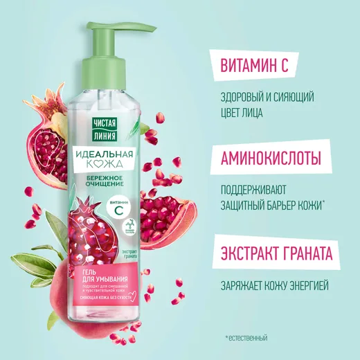 Средство разработано для девушек с нормальной и комбинированной кожей. Этот гель для умывания сделает твой утренний уход за кожей лица особенно нежным – продукт не содержит мыла и деликатно очищает, не вызывая неприятного ощущения сухости. Как и другие товары бренда Чистая Линия, он изготовлен на основе натуральных природных компонентов. Гель для лица с экстрактом граната дарит клеткам эпидермиса антиоксиданты и витамины для тонуса и энергии, а входящая в состав эссенция ромашки активизирует восстановление кожи, питает ее и увлажняет на целых 24 часа!
