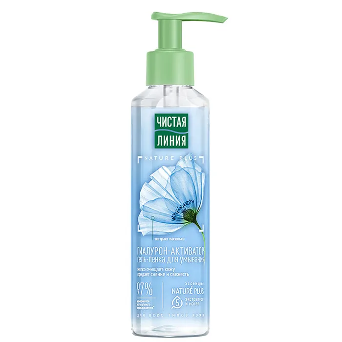 Умывание – важный шаг к чистой и ухоженной коже. Гель-пенка для умывания от бренда Чистая Линия мягко очищает кожу и придает сияние и свежесть. Сбалансированный состав содержит 97% компонентов натурального происхождения*, среди которых: эссенция из пяти экстрактов и масел NATURE PLUS (экстракт вербены, экстракт пиона, масла миндаля, льна, оливы), а также экстракт василька и растительный гиалурон-активатор.