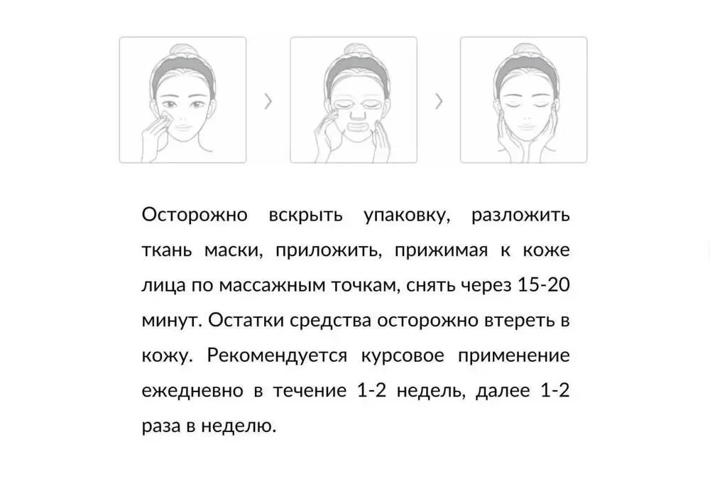 Извлеките продукт из упаковки и наложите его на лицо. Разгладьте салфетку, выводя все пузырьки воздуха. Проводите процедуру получаса, после чего снимите маску, а оставшуюся на лице жидкость вотрите в кожу. Не смывайте средство, чтобы усилить воздействие питательных веществ на ткани