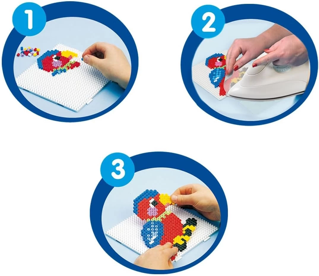 Вы можете придумывать свои собственные сюжеты , или воспользоваться руководством из комплекта. Уложите бусины на доске по своему желанию так, чтобы получить нужный вам результат. Вы можете перемещать бусины с места на место до тех пор, пока они не проглажены утюгом, после этого бусины уже не возможно перемещать. Горячим утюгом, слегка нажимая, мелкими вращательными движениями проведите по гладильной бумаге, покрывающей рисунок на доске. После короткого времени глажки цвета бусинок неожиданно станут более отчетливо видны через бумагу, что является признаком того, что аппликация готова. Осторожно снимите гладильную бумагу и дайте аппликации остыть, не снимая её с доски. При необходимости повторите глажку через гладильную бумагу. Осторожно снимите аппликацию с доски. Лучший результат достигается, когда аппликация полностью остывает под небольшим прессом, например книгой.