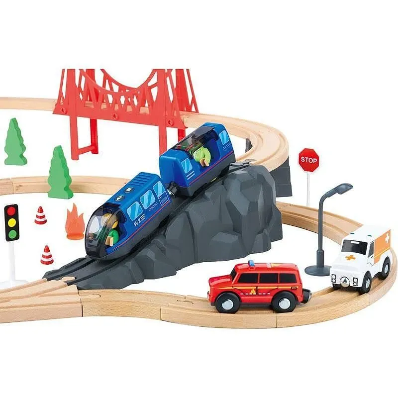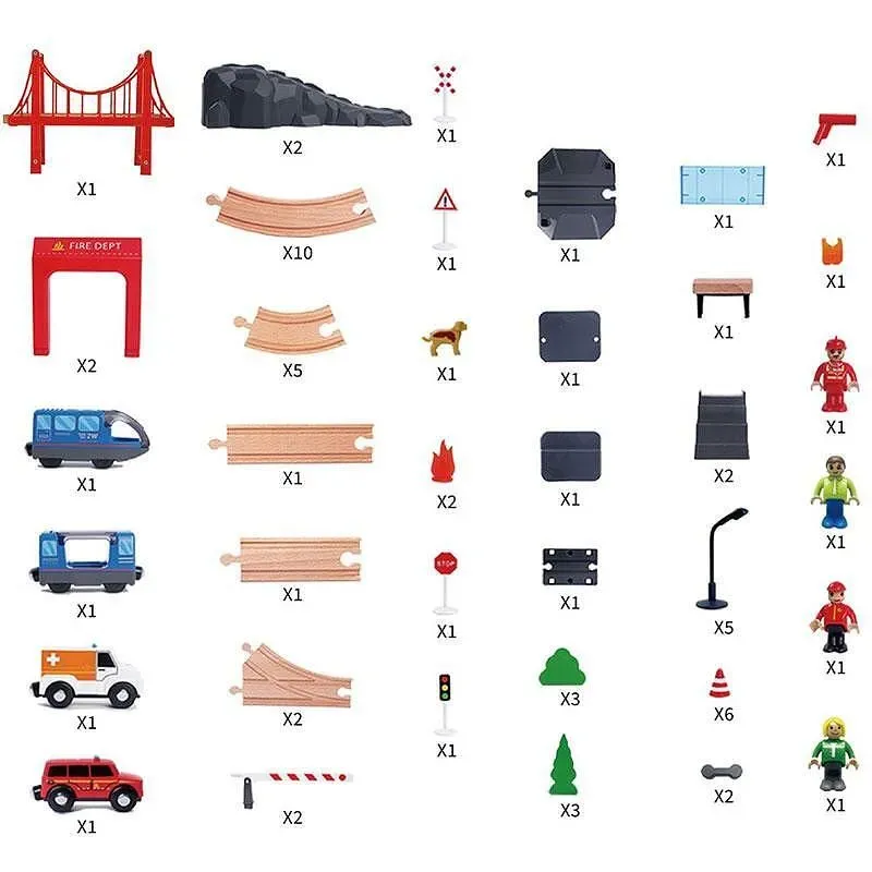 Любой мальчишка будет рад такому волшебному подарку. Набор состоит из 70 деталей: поезд со звуковыми эффектами, в который можно поместить фигурки, 2 машины, рельсы, горка-трек, светофоры, кусты и фонари. Дети могут построить любой маршрут для поезда, используя различные пути, препятствия или горки.
