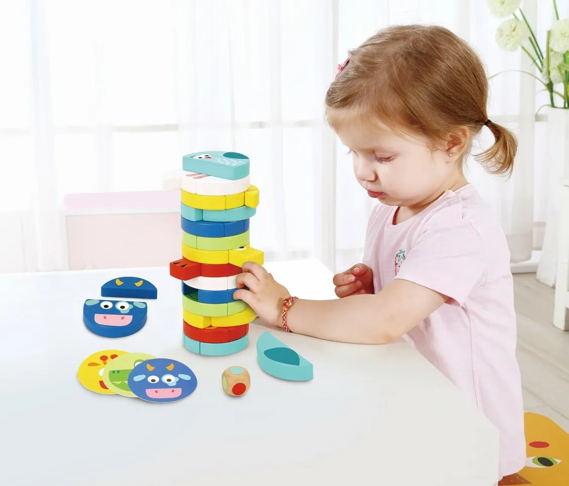 Вот как это работает: складывайте разноцветные деревянные кирпичики в башню, а затем по очереди бросайте кубики. Кубики определят, кирпич какого цвета вам нужно аккуратно снять с башни, не дав ему упасть. Но это еще не все! Для дополнительного испытания попробуйте стратегически правильно удалить части, чтобы открыть и собрать соответствующую голову животного.