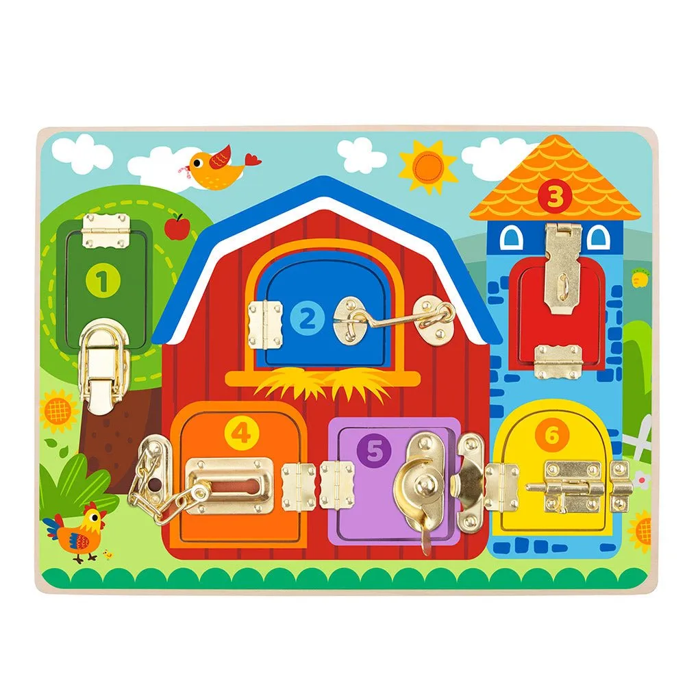 Вашему ребенку понравится манипулировать различными защелками, открывать и закрывать дверцы и находить спрятанные внутри сюрпризы. Сама доска изготовлена из прочного дерева и имеет высококачественную отделку.