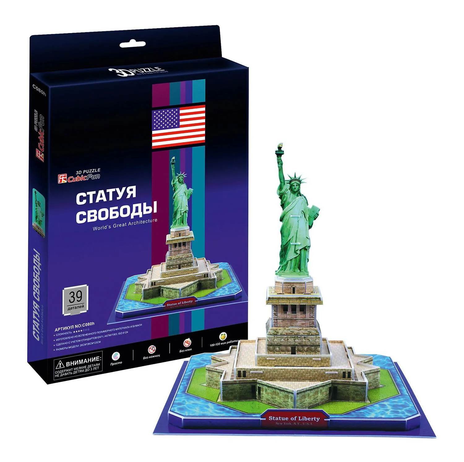 Коллекция CubicFun представляет 3D-конструктор Статуя Свободы, который познакомит школьников с одним из главных символов Америки. Монумент знаком каждому человеку по фильмам, а дети видят его в школьных учебниках. Теперь мальчики и девочки смогут слепить из пазлов скульптуру своими руками. Точная копия статуи дает возможность изучить все детали конструкции.