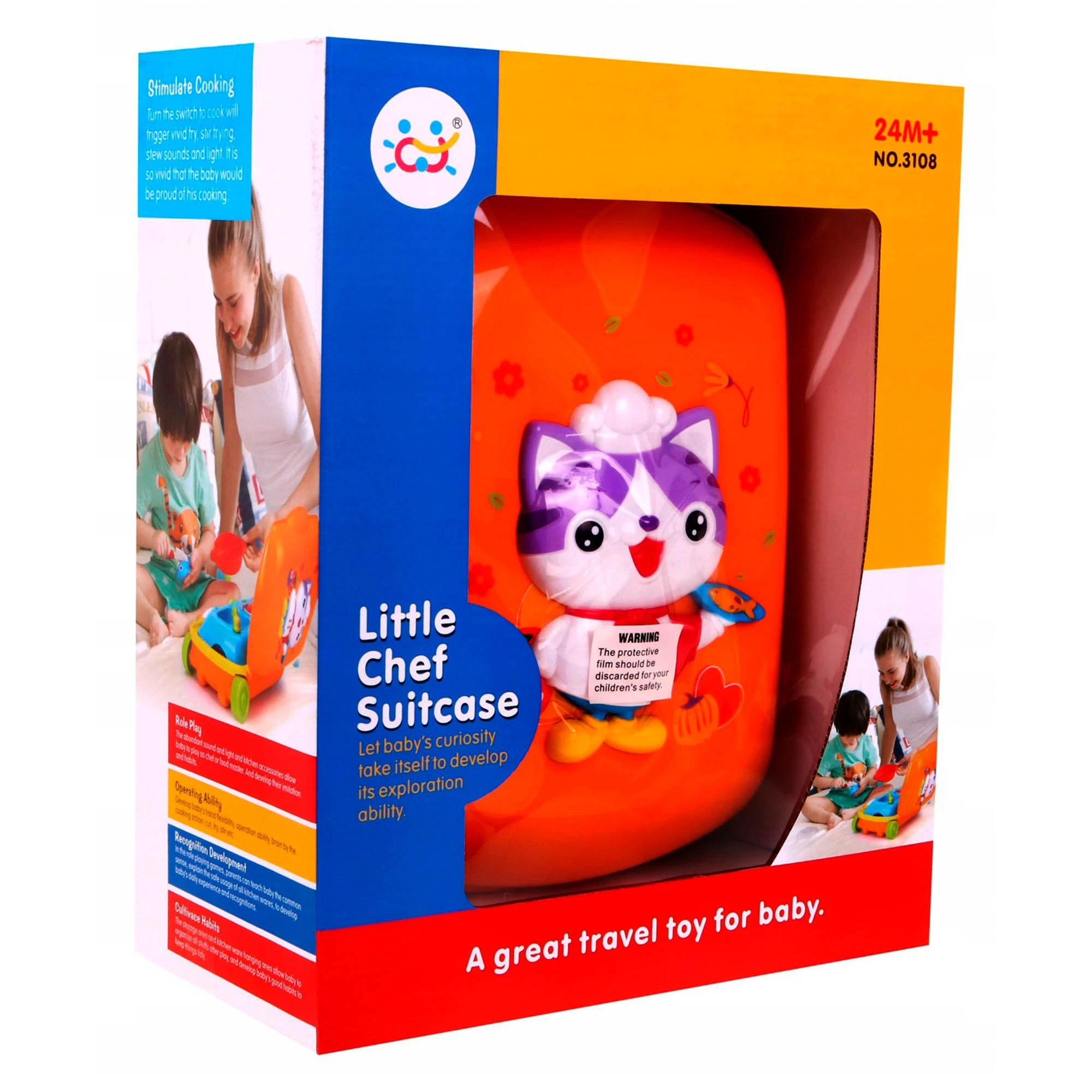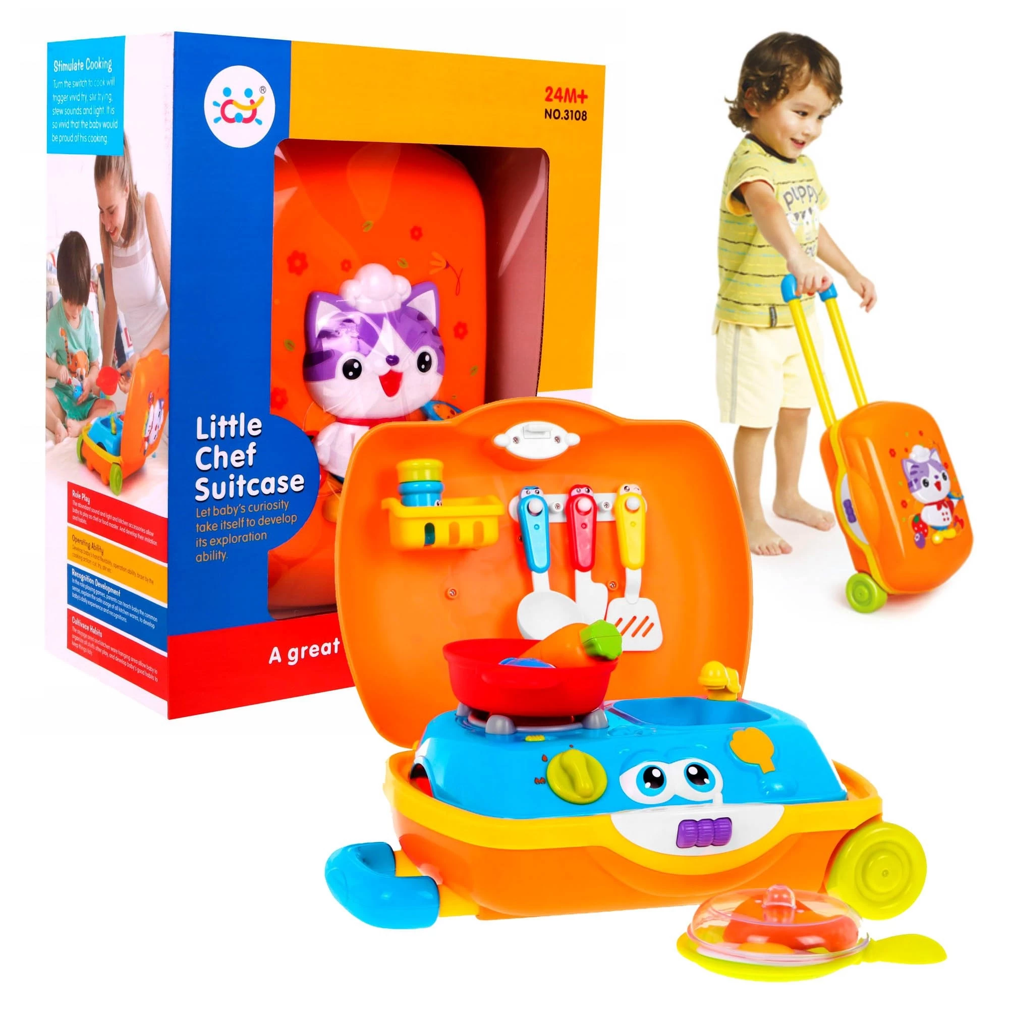 Игрушка представлена в виде кейса на колёсиках с удобной выдвижной ручкой. Набор «Маленького шеф-повара» содержит всё, что нужно маленькому шеф-повару, чтобы порадовать окружающих блюдами собственного приготовления: интерактивная столешница с горелкой и раковиной, яркие кухонные приборы и продукты питания, отдел с подвешенными инструментами.