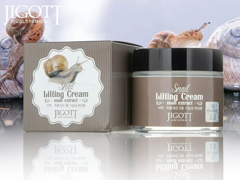 Snail Lifting Cream. Крем для лица Jigott. Крем на основе муцина улитки эффективно увлажняет, разглаживает текстуру кожи, придает мягкость и эластичность. Аллантоин и растительный комплекс из экстрактов зеленого чая и листьев алое оказывают противовоспалительное действие, успокаивают кожу и стимулируют процессы регенерации. Ниацинамид и аденозин осветляют, повышают эластичность и дарят сияние коже.