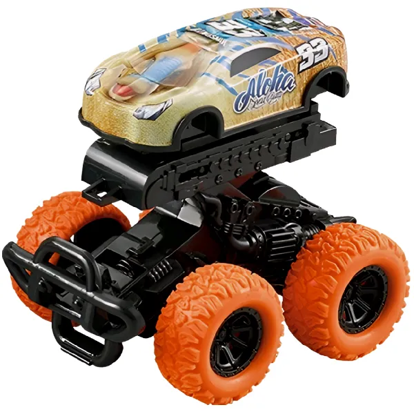 Корпус внедорожника сделан из высококачественного пластика, колёса – из резины, а также машина обладает мощными рессорами. Особенностью внедорожника является то, что машинка фрикционная, и для движения необходимо откатить её назад и отпустить. Пружины амортизации подвижны и могут сжиматься и разжиматься.