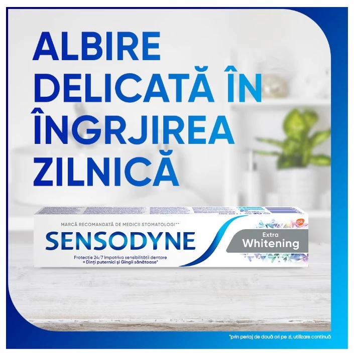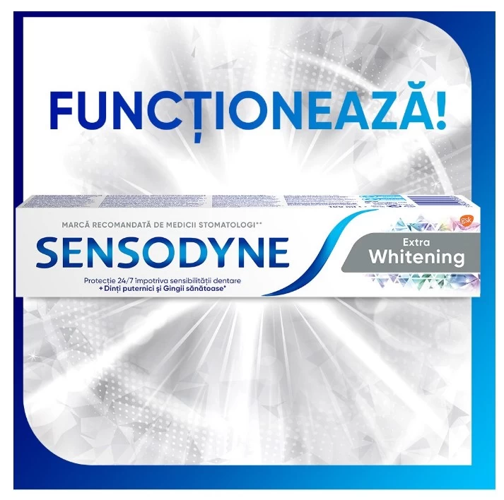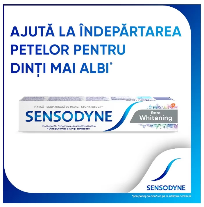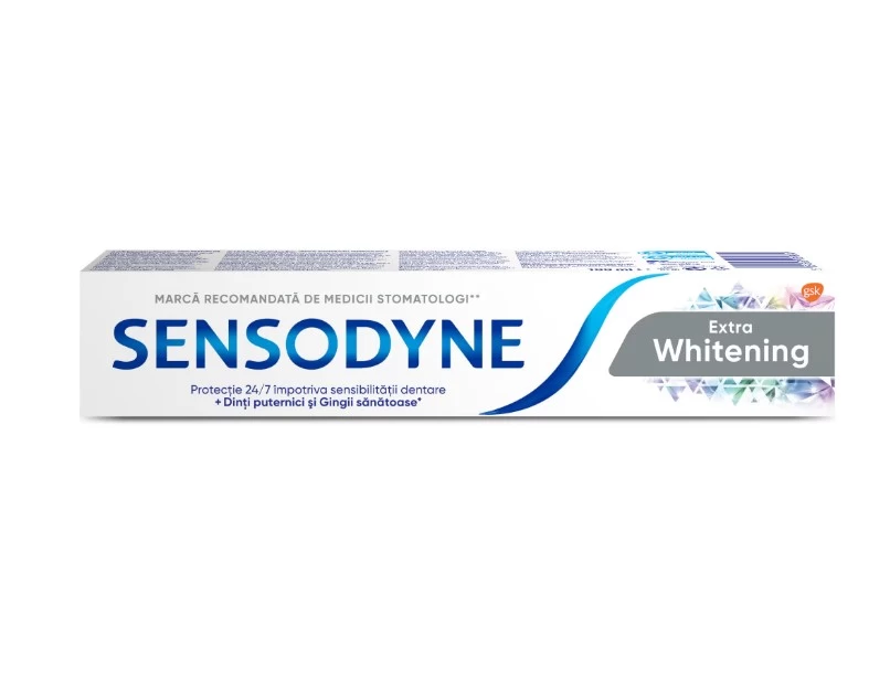 Поскольку улыбка в наши дни стала визитной карточкой, Sensodyne Extra Whitening помогает удалить экзогенные пятна, чтобы улыбка была белее и ярче, чем когда-либо прежде. Ее формула содержит триполифосфат натрия и частицы глинозема, которые восстанавливают естественную белизну зубов, не повреждая ткани зуба, удаляя налет как над, так и под десной.
