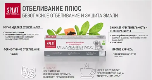Любители чая, кофе, сигарет или вина не понаслышке знают, что все эти продукты оставляют видимый след на поверхности зубов. Чтобы избавиться от этих внешних проявлений, сделать свою улыбку белоснежной, а дыхание свежим, воспользуйтесь специальной пастой от Splat Professional White plus. Она обогащена множеством активных компонентов, которые в сочетании с натуральными природными экстрактами эффективно устраняют все загрязнения, а также заботятся о здоровье зубов и десен.