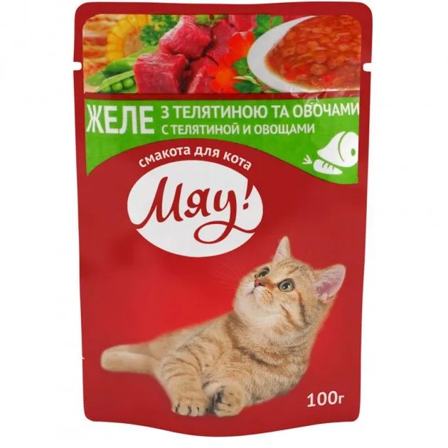 - Мяу! Влажный корм для кошек с телятиной и овощами в желе 100г