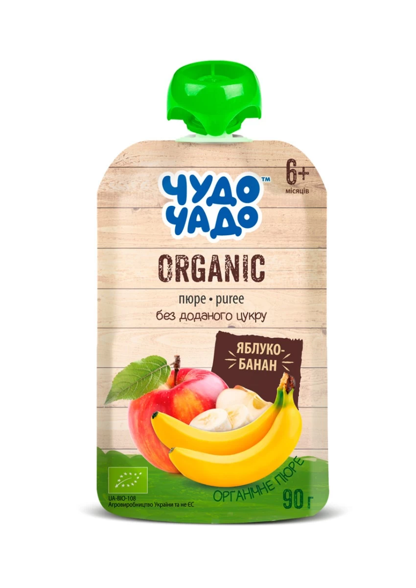 Состав: пюре яблочное органическое (70%), пюре банановое органическое (30%).