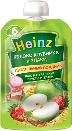 Детские злаковые пюре Heinz сделаны с добавлением цельнозерновой муки, изготовленной из всех частей зерна, включая зародыш и отруби, что позволяет сохранить всю пользу злаков. Фрукты в составе пюре богаты аскорбиновой кислотой пектином, магнием, железом и растительной клетчаткой. Пюре Heinz «Яблоко, клубника, злаки» созданы с заботой о ваших малышах. 100% натуральные фрукты.