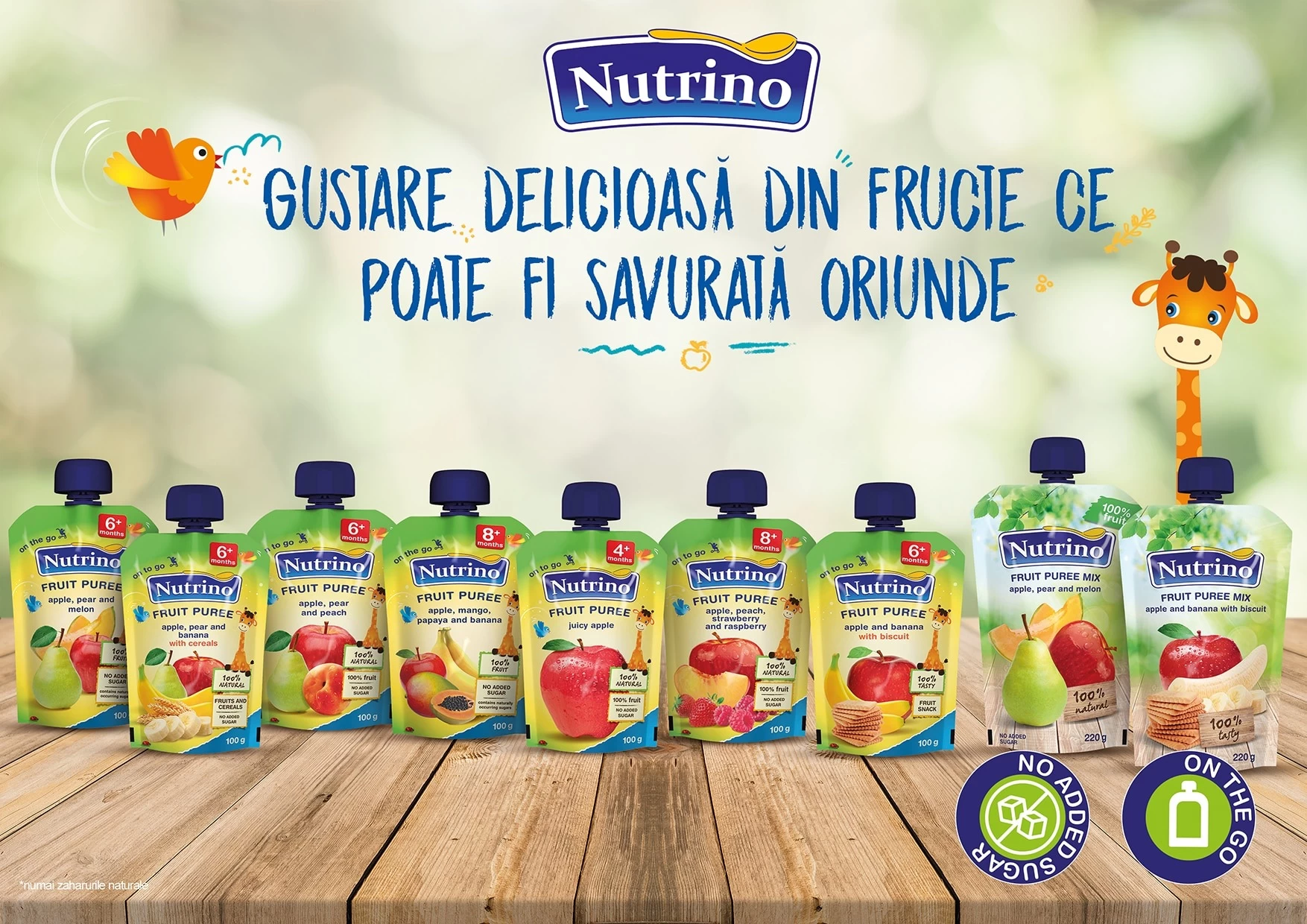Фруктовое пюре Nutrino (Нутрино) Pouch с яблоком, бананом и печеньем - это вкусный и полезный продукт для малышей от 6 месяцев. Не содержит глютен.