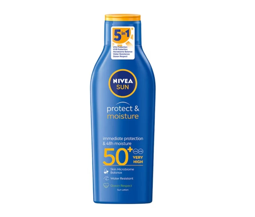 NIVEA SUN Protect & Moisture Солнцезащитный и увлажняющий лосьон с SPF 50 обеспечивает эффективную защиту от солнца благодаря надежной формуле с пятью основными преимуществами.