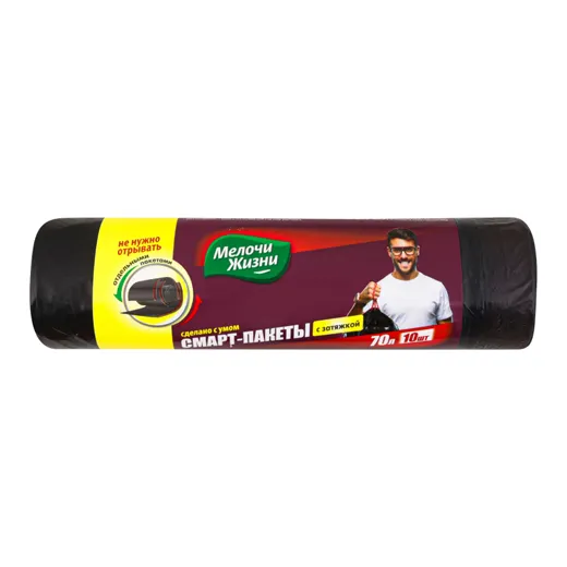 Мусорные пакеты Мелочи Жизни с удобной затяжкой для мусорного бака объемом до 70 л.