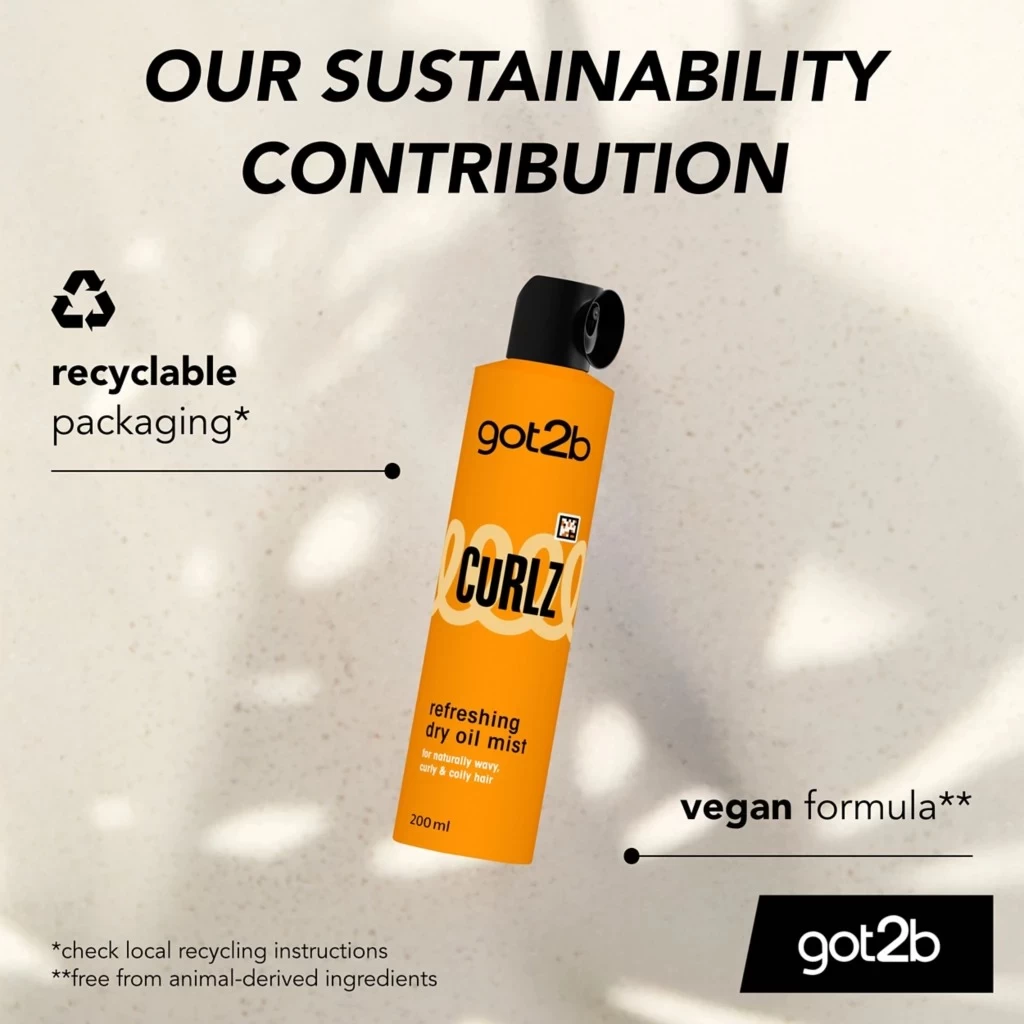 got2b Curlz Styling Cream Curlz Освежающий сухой масляный спрей для блестящих, пышных и оживленных локонов, идеально подходит для естественно волнистых, кудрявых и вьющихся волос.