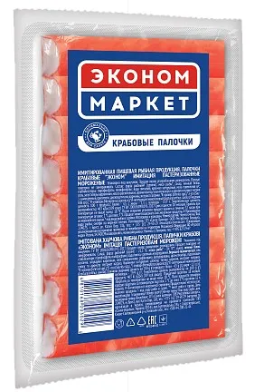 Фарш рыбный (сурими) (мясо рыбы, регуляторы кислотности Е450, Е451), крахмал кукурузный, мука пшеничная в/с, сахар, соль, загуститель каррагинан, масло растительное, ароматизатор (содержит натуральный аромат краба), усилитель вкуса и аромата глутамат натрия, красители: диоксид титана, кармин, экстракт паприки; вода.