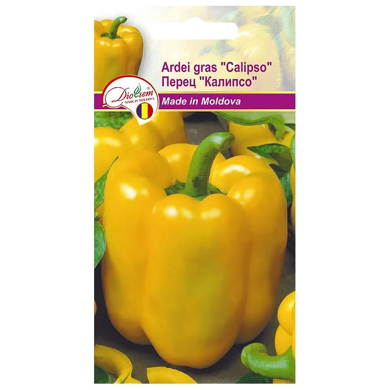 Перец «Калипсо» — это раннеспелый сорт с высокой урожайностью. Куст стандартный, высотой 50–55 см. Период от посадки рассады составляет 4–6 недель или 70–75 дней. На одном растении образуется 14-18 плодов кубической формы, длиной 7-9 см, шириной 6-8 см, весом 150-200 г. При технической спелости плоды имеют желтый цвет. Мякоть сладкая, сочная, с приятным вкусом и ароматом, толщиной 7-9 мм. Используется в технической и биологической зрелости, в свежем виде и для переработки.