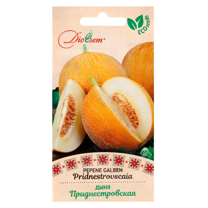 Дыня "Приднестровская" - сорт ранний. Растение среднеплетистое, вегетационный период 70-75 дней. Плод овальной формы, массой 0,7-1,8 кг. Поверхность гладкая, желтая, сетка средне-ячеистая, густая. Рисунок - зеленые прерывистые пятна, расположение в виде ленточек, желтеющие при созревании. Мякоть бело-зеленая, толстая, хрустящая, сладкая.