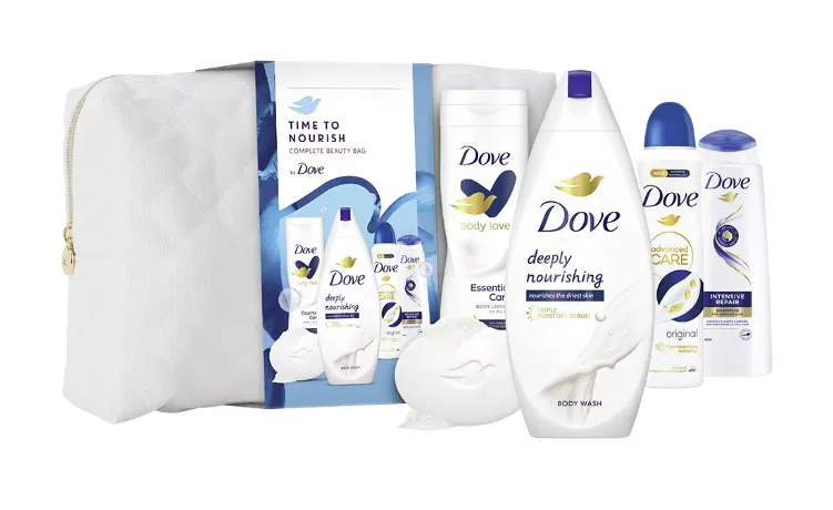 Побалуйте себя и своих близких глубоко питательным гелем для душа Dove 250 мл + дезодорантом Dove Original 150 мл + лосьоном для тела Dove Essential Care + твердым мылом Dove Original 90G + шампунем Dove Intensive Repair Shampoo 250 мл + подарочный пакет
