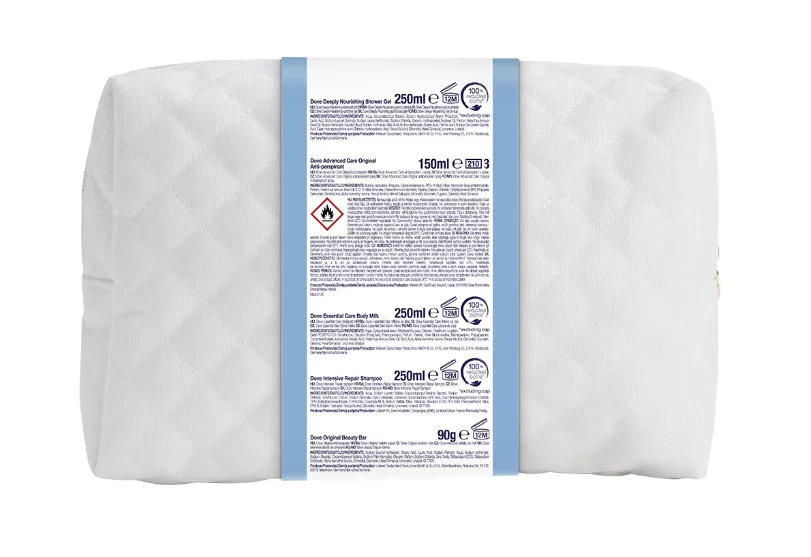 Подарочный набор Dove: гель для душа Dove Deeply Nourishing, 250 мл + дезодорант Dove Original, 150 мл + лосьон для тела Dove Essential Care + твердое мыло Dove Original 90G + шампунь Dove Intensive Repair Shampoo 250 мл + подарочный пакет