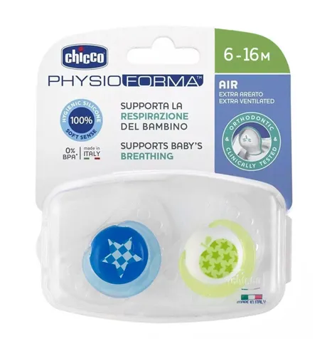 Новая серия пустышек Chicco “Physio Air” с ортодонтической активной соской обеспечивает дополнительную вентиляцию, заботясь о нежной коже малыша!