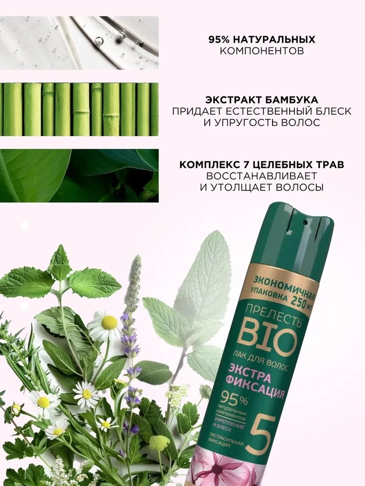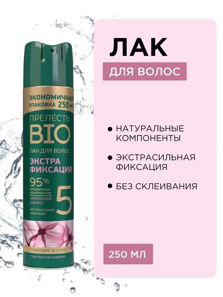 Лак Прелесть BIO Экстрафиксация — это продукт, который не только безупречно фиксирует укладку, но и заботится о здоровье ваших волос. Экстракт бамбука в составе способствует восстановлению естественного блеска и упругости, защищает их от воздействия окружающей среды солнечного света благодаря UV-фильтрам. Этот профессиональный лак содержит 95% натуральных компонентов и сочетает в себе сильную фиксацию и заботу о здоровье ваших локонов, обеспечивая отличные результаты и объем без ущерба для их состояния.