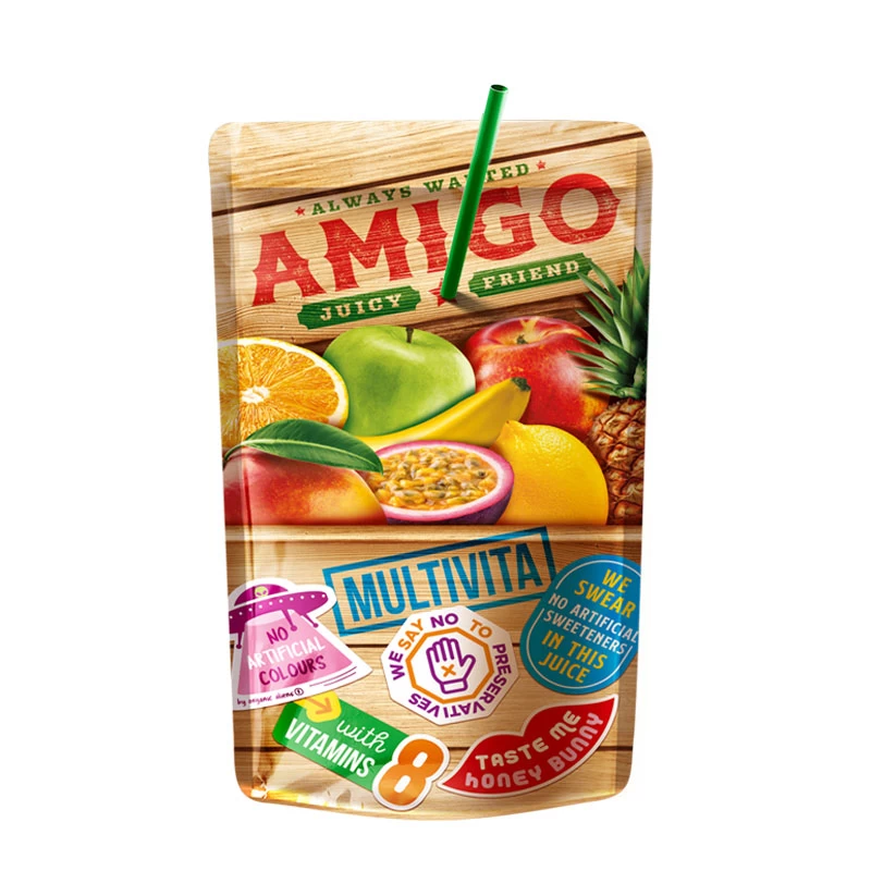 Amigo Multivita – это вкусный напиток на основе фруктового сока (апельсин, яблоко, банан, ананас, маракуйя и т. д.), обогащенный 8 витаминами. Без искусственных красителей, без искусственных подсластителей и без консервантов. Пакет с трубочкой идеально подходит для школы, офиса или в дорогу.