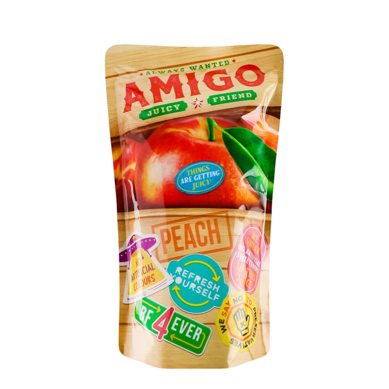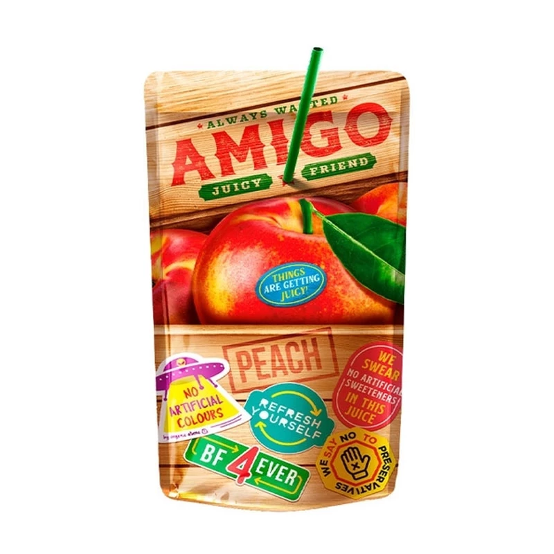 Amigo Peach — это освежающий напиток/нектар с интенсивным вкусом персика, упакованный в практичный пакет с соломинкой — идеально подходит для школы, офиса или в дорогу. Быстро и приятно освежает.