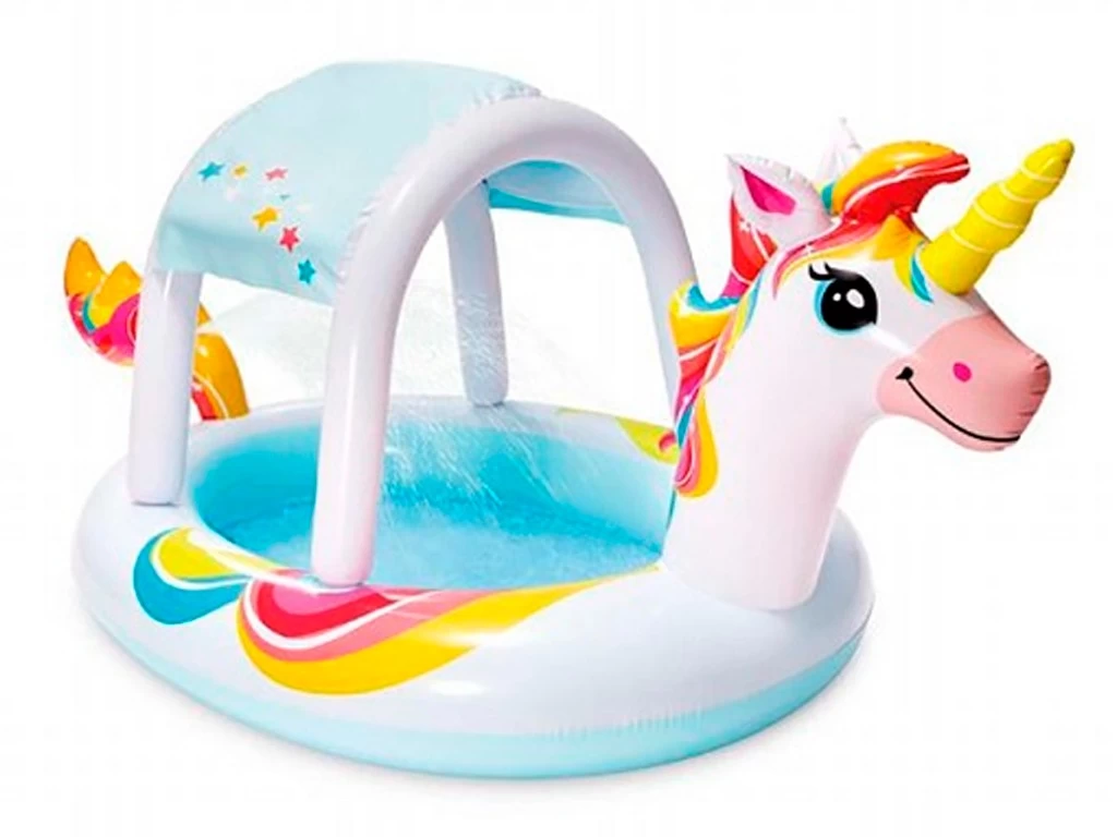Детский бассейн “Unicorn Spray Pool” Intex – новинка 2022 года с надувным навесом, который укроет Вашего малыша от солнца в знойный летний день.
