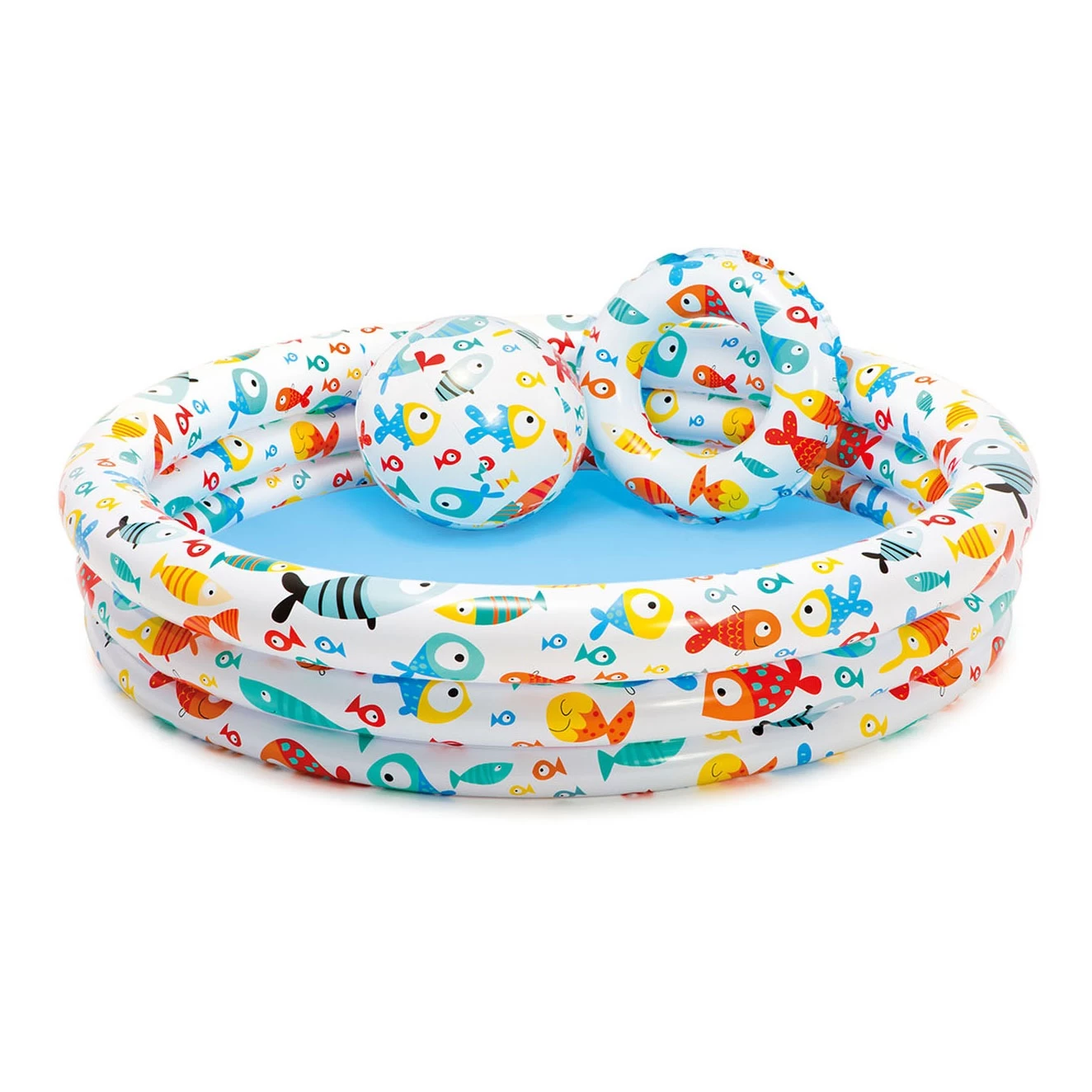 Играйте на свежем воздухе с водой между разноцветными рыбками! Вы можете сделать это в этом белом аквариуме-бассейне Intex. В комплекте с надувным бассейном поставляются пляжный мяч и бассейн. Круглый аквариум Intex Swimming Pool имеет диаметр 132 сантиметра.